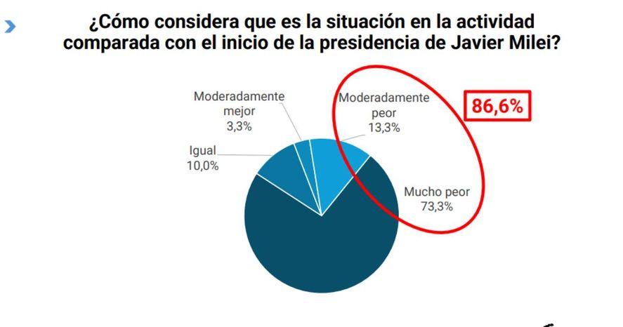 En base a la consulta a mรกs de una treintena de sindicatos, un 86,6% de los encuestados considera que la situaciรณn de la actividad empeorรณ desde la llegada al poder de Javier Milei (73% cree que el escenario es mucho peor y un 13,3% que es moderadamente peor). Apenas un 10% seรฑala que la situaciรณn fue igual al 2023 y un 3,3% considera que estuvo moderadamente mejor.