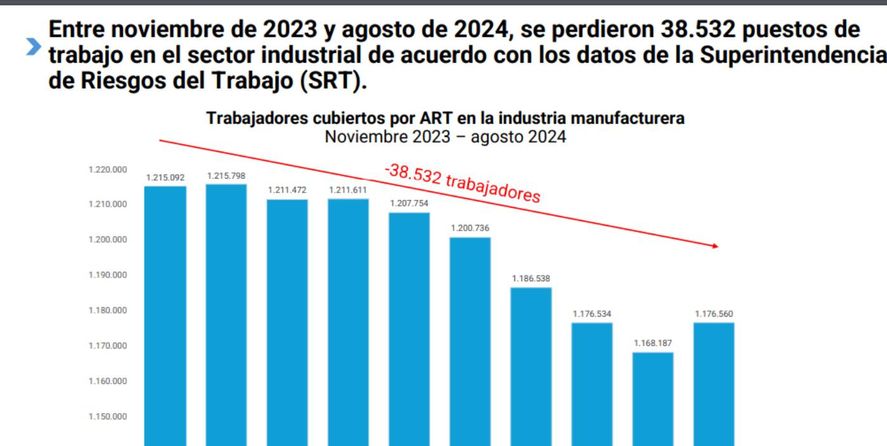 Segรบn detalla el estudio entre noviembre de 2023 y agosto de 2024 se perdieron 38.532 puestos de trabajo en la industria, de acuerdo con los datos de la Superintendencia de Riesgos del Trabajo (SRT). Los nรบmeros son mรกs dramรกticos si se incluyen a los sectores de la “Construcciรณn” y “Minerรญa“: la pรฉrdida de puestos de trabajo asciende a 126.050.