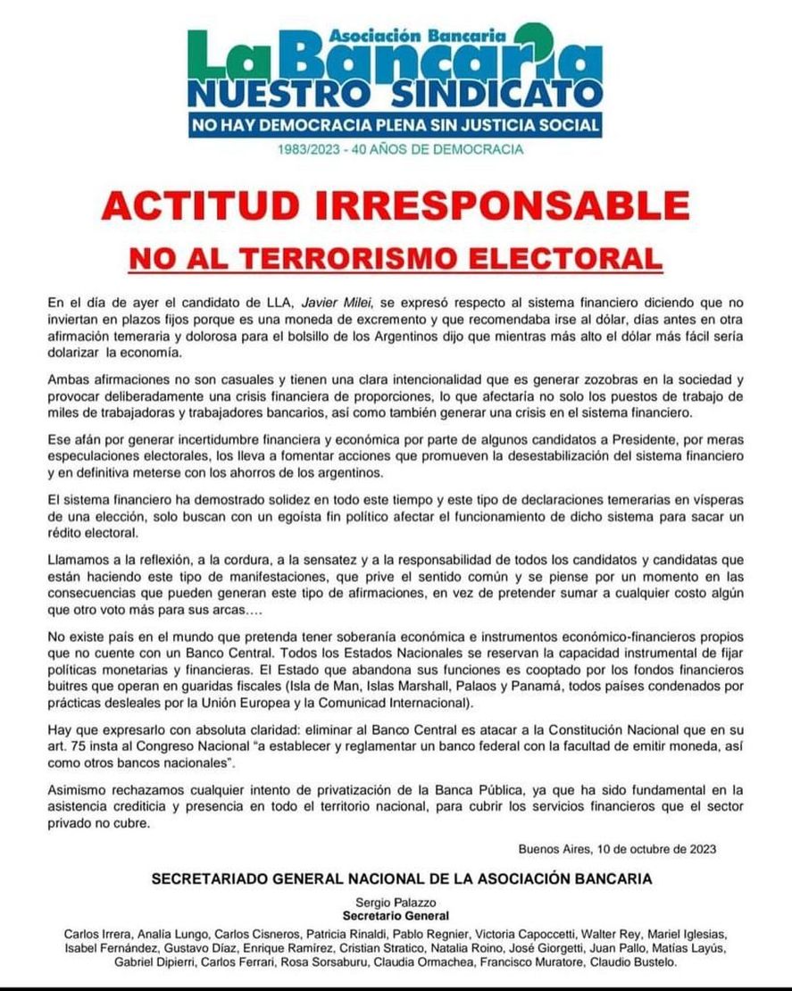 En ese contexto, desde el gremio que nuclea a los empleados bancarios, señalaron que en el “afán por generar incertidumbre financiera y económica por parte de algunos candidatos a presidente, por meras especulaciones electorales, los lleva a fomentar acciones que promueven la desestabilización del sistema financiero y en definitiva meterse con los ahorros de los argentinos”.