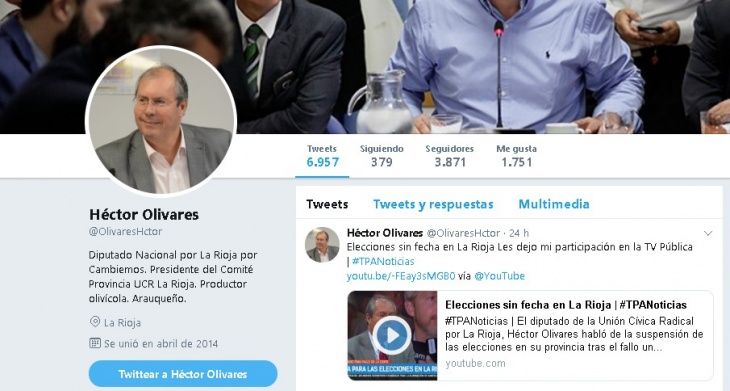 “Diputado Nacional por La Rioja por Cambiemos. Presidente del Comité Provincia UCR La Rioja. Productor olivícola. Arauqueño”, así se autodenomina el legislador en su cuenta personal de twitter.