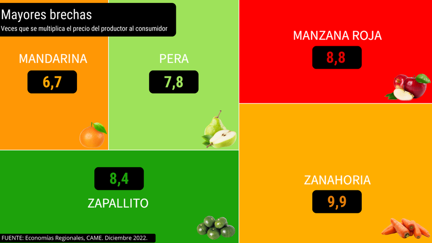 Según la CAME, “entre los cinco productos que presentaron mayor diferencia entre los precios de origen y destino se encuentran la zanahoria (9,9 veces), la manzana roja (8,8), el zapallito (8,4), la pera (7,8) y la mandarina (6,7 veces)”.
