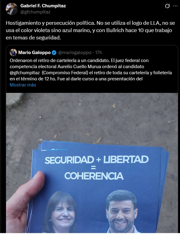 La ministra, por su parte, dejó en claro su posición mediante un mensaje en X: “Oíme, Chumpitaz: tenés 12 horas para acatar el fallo judicial y sacar los carteles donde usás mi cara sin permiso y sin pertenecer al espacio”. Bullrich también remarcó públicamente su respaldo al candidato de LLA en Santa Fe, Agustín Pellegrini.