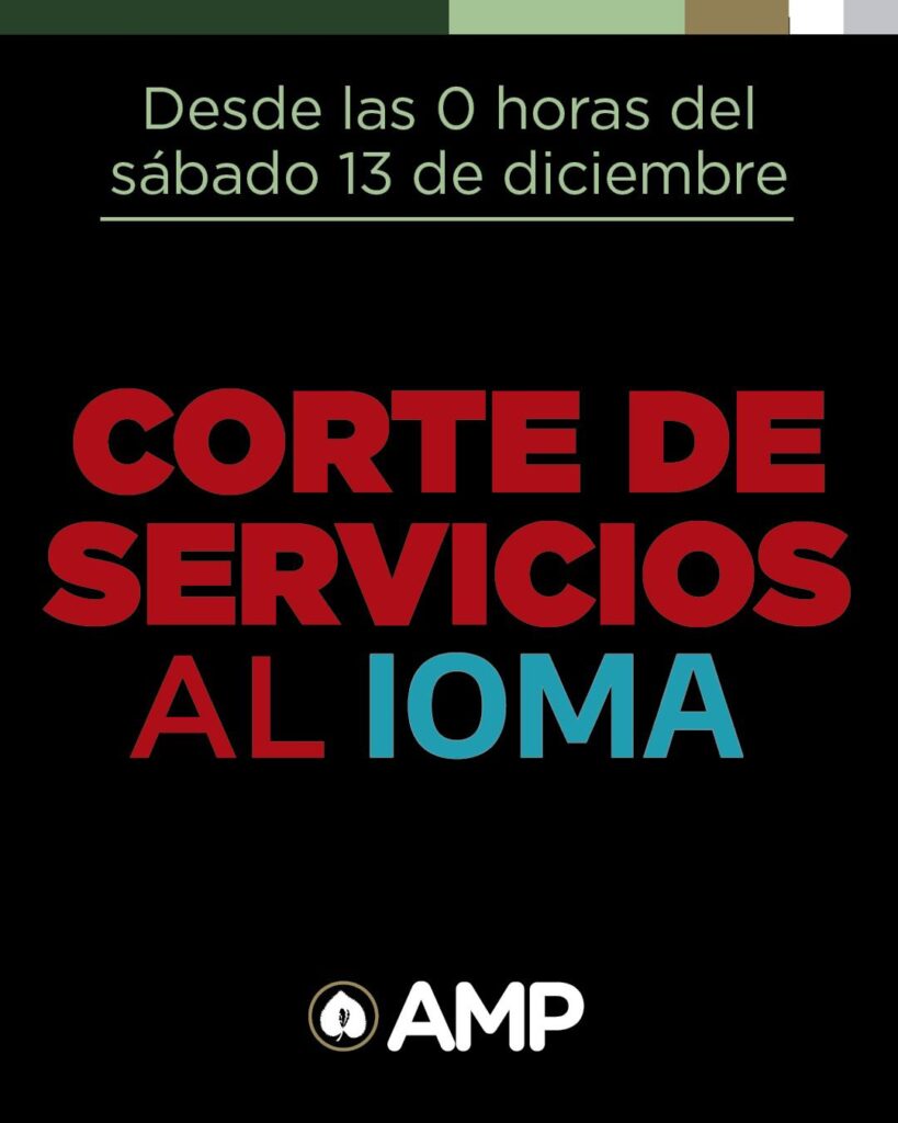 La Agremiación Médica Platense informó que a partir de las cero horas del sábado 13 de diciembre se llevará adelante un corte de servicios a afiliados del Instituto de Obra Médico Asistencial (IOMA), como consecuencia del incumplimiento en los pagos correspondientes a prestaciones ya realizadas.