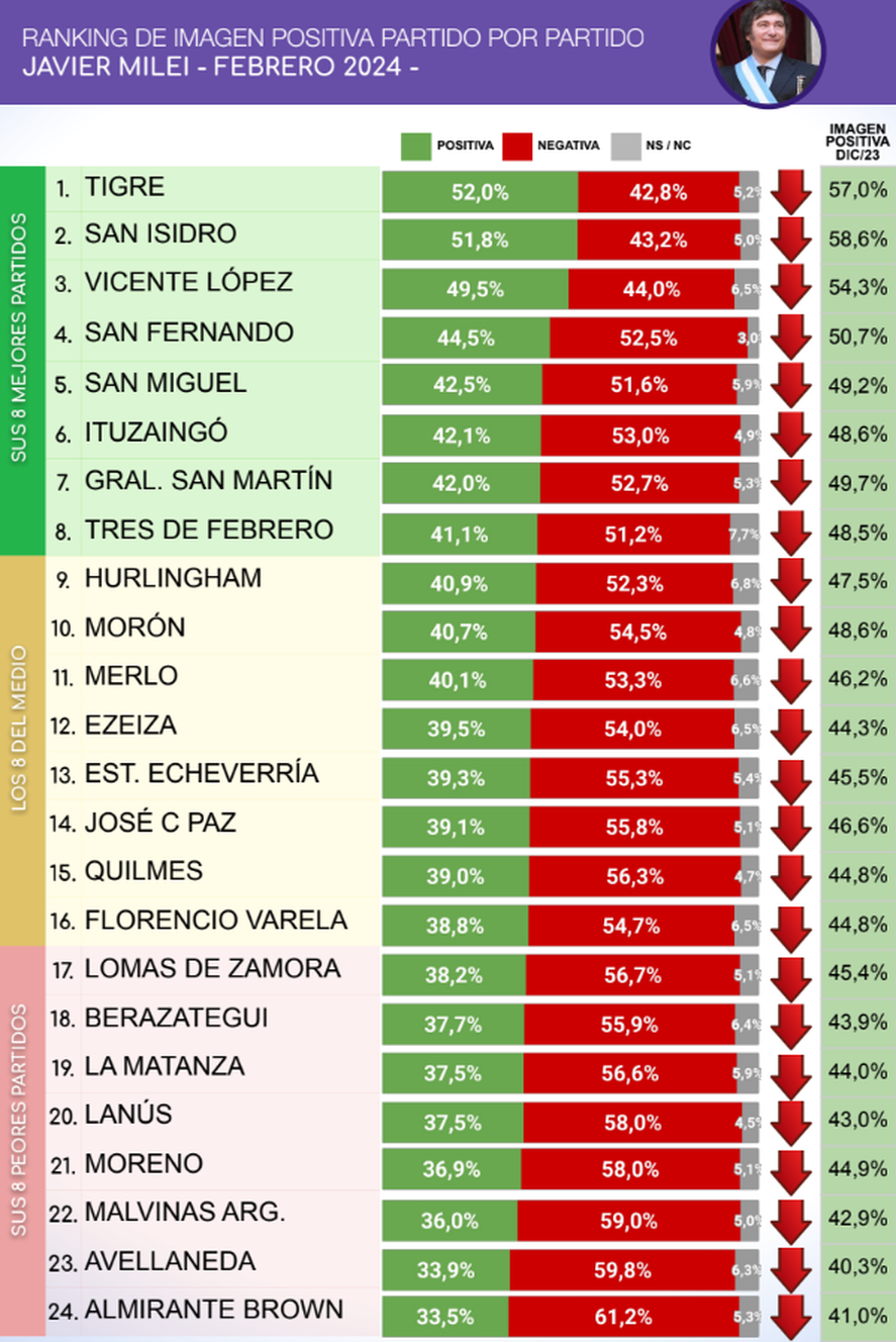Según los datos recopilados por la encuestadora, en sólo tres partidos del GBA la imagen de Milei es positiva: Tigre (52%), San Isidro (51,8%) y Vicente López (49,5%). En contraposición, los tres partidos donde peor calificaron la imagen del presidente fue en Almirante Brown (33,5%), Avellaneda (33,9%) y Malvinas Argentinas (36%).