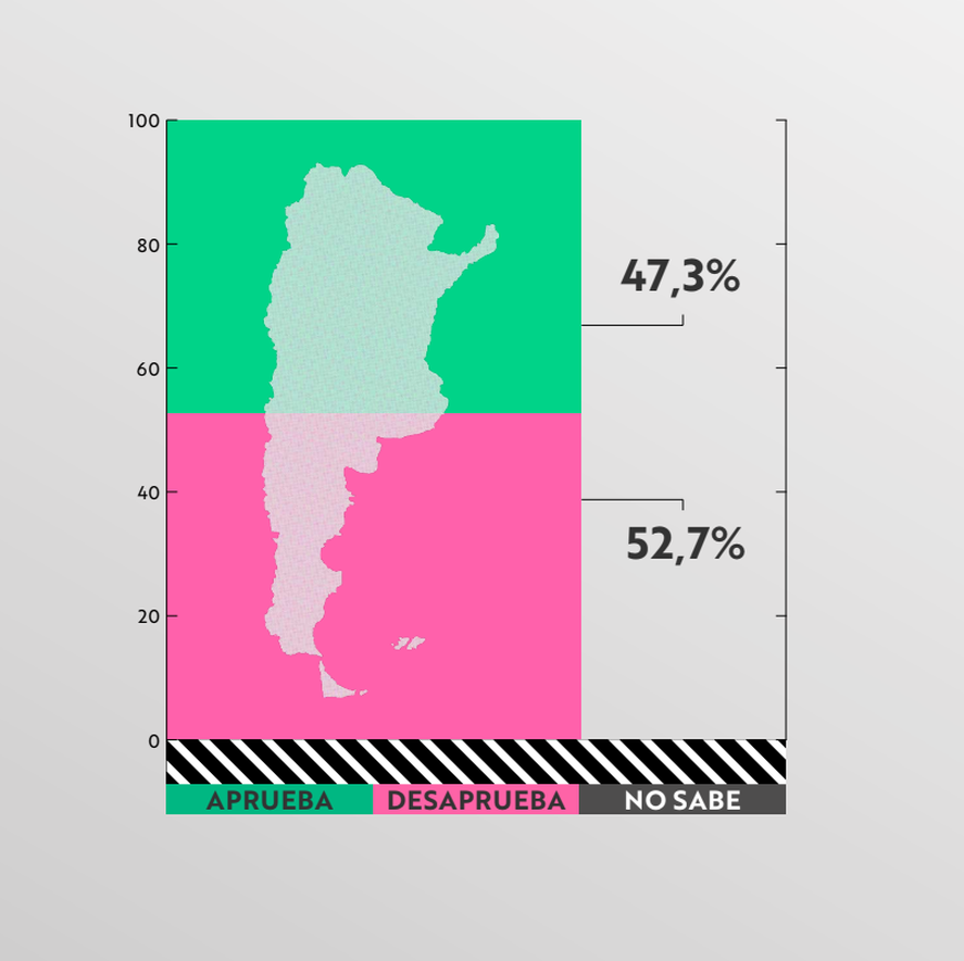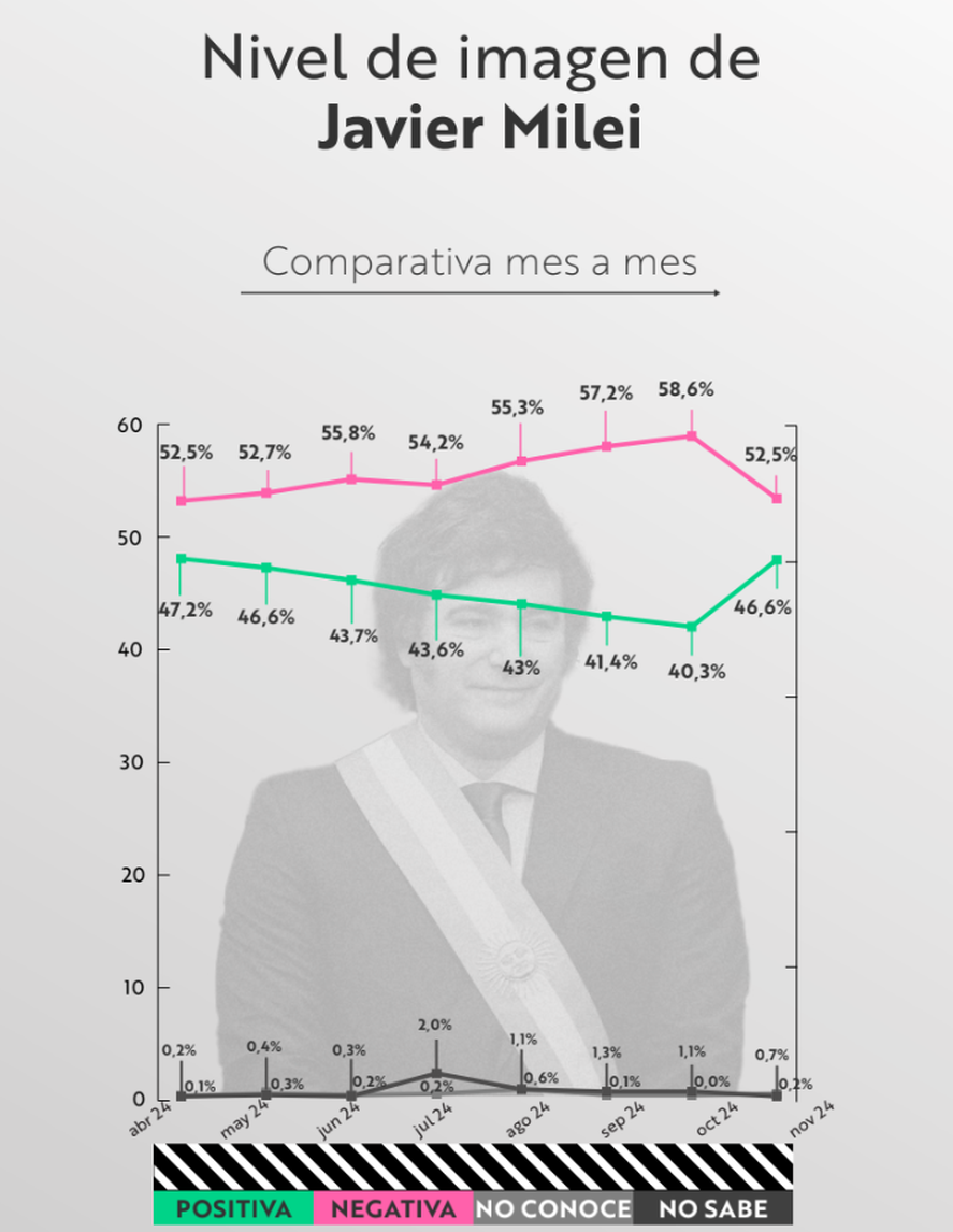 En un escenario de gran polarización, el 52,7 por ciento de los argentinos desaprueba lo hecho por Milei en su primer año, meintras que el 47,3 por ciento aprueba la gestión libertaria. Son números similares a la imagen que tiene el Presdiente: 52,5 por ciento negativa y 46,6 por ciento positiva.