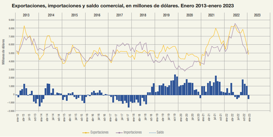 En relación al mismo mes del 2022, las exportaciones cayeron un -11%, mientras que las importaciones crecieron 2,5%; lo que explicó el resultado negativo.