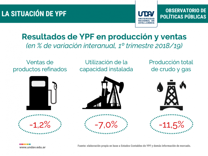 El Observatorio de Políticas Públicas de la Universidad Nacional de Avellaneda (UNDAV) dio a conocer que “los números contables de YPF marcan un rojo de $ 8.153 millones en el primer trimestre de 2019”. De esta manera, se convirtió en el peor resultado en los últimos años, solo por detrás del ocurrido en el tercer trimestre de 2016, en el orden de los $30.256 millones.