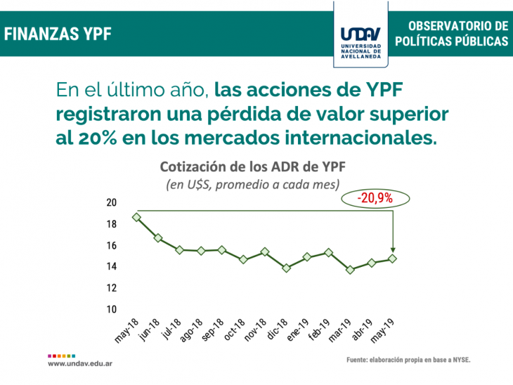 “En el último año la firma pasó de poseer una cotización por acción de unos 19 dólares (en el mercado estadounidense) a menos de 15 dólares en la actualidad”, explica el informe de la UNDAV.