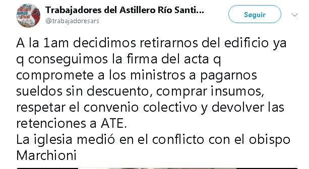 “La iglesia medió en el conflicto con el obispo Marchioni”, podía leerse esta madrugada en la cuenta de Twitter @trabajadoresars. Hacían referencia al presbítero Rubén Marchioni, quien fue nombrado recientemente por el nuevo Arzobispo, Víctor “Tucho” Fernández, como Director diocesano de Pastoral social.
