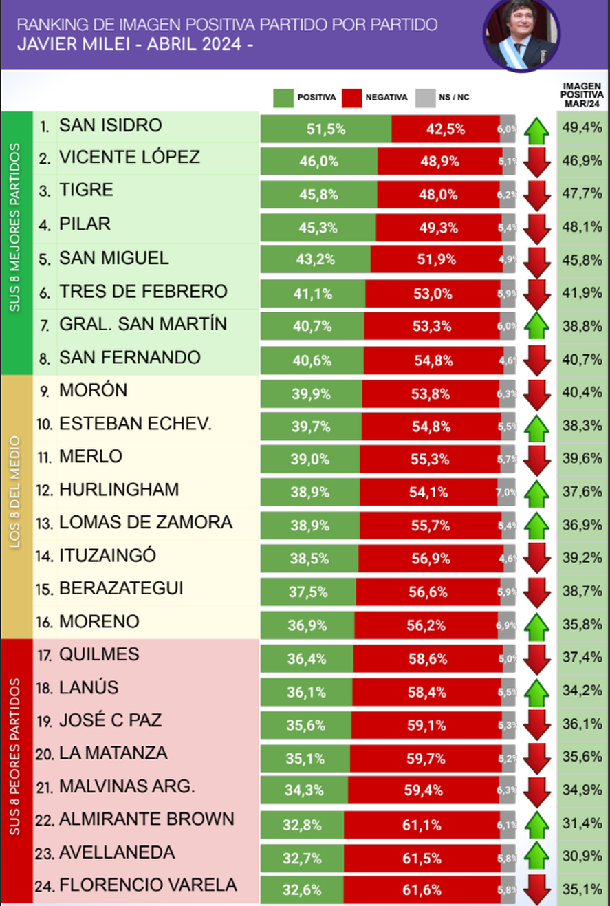 Según el ranking de esta consultora, la imagen de Milei es negativa en casi todo el conurbano y, mes a mes, pierde popularidad. Solo en San Isidro su imagen es positiva -aunque no tanto- y marca una tendencia a la baja desde el último ranking de diciembre del 2023, cuando todavía era respaldado en casi la mitad de los municipios (a pocos días de su asunción). En tanto, un dato que favorece a Milei es que en 9 de los municipios consultados, la imagen positiva fue mayor a la del mes pasado.