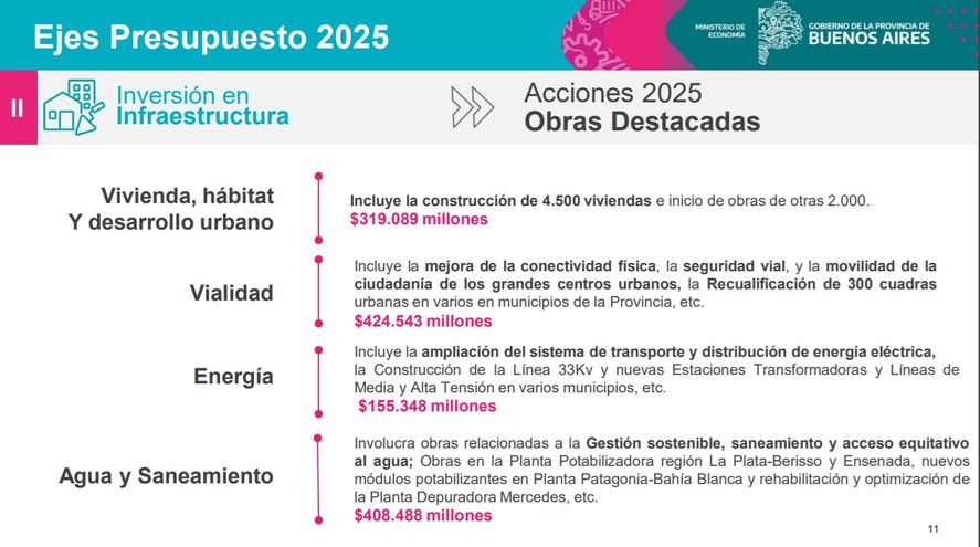 El presupuesto 2025 contempla una serie de inversiones estratégicas en infraestructura con el objetivo de mejorar la calidad de vida de los habitantes de la provincia y, a la vez, impulsar el crecimiento económico. Estas inversiones están distribuidas en diversos sectores clave como vivienda, vialidad, energía, agua y saneamiento, salud, seguridad y educación. En total, la inversión en infraestructura asciende a una cifra significativa de $2.682.725 millones, representando un 7,8% del gasto total proyectado.