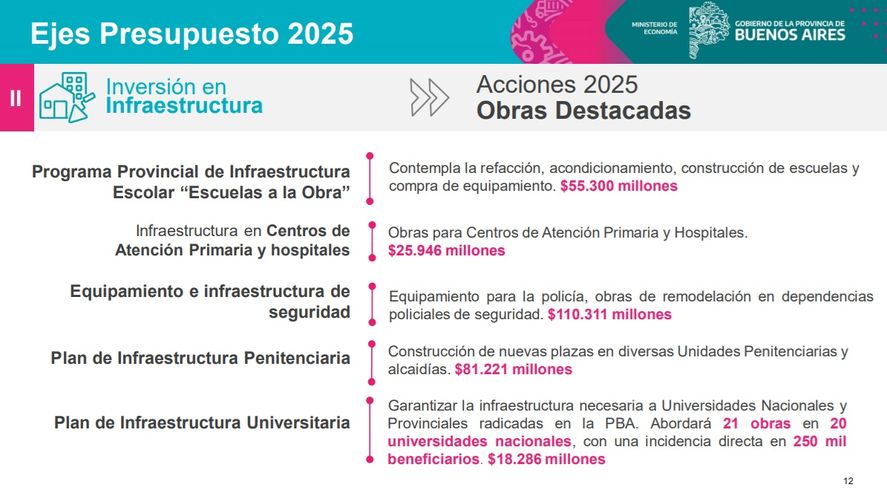 Finalmente, el presupuesto contempla una partida de $18.286 millones para garantizar la infraestructura necesaria para las universidades nacionales y provinciales ubicadas en la Provincia de Buenos Aires, siendo este uno de los sectores que mas han sentido el ajuste del gobierno de Milei. Este plan incluye la realización de 21 obras en 20 universidades nacionales, con una incidencia directa sobre 250 mil estudiantes.