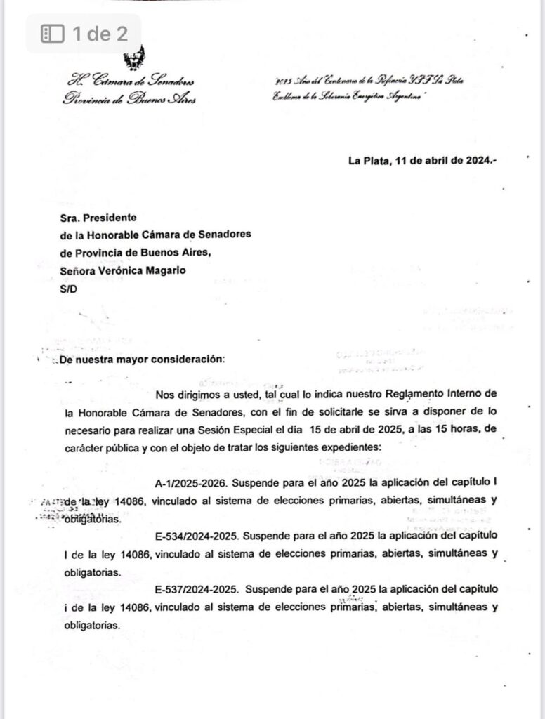 Por su parte, 13 senadores opositores le pidieron a la vicegobernadora y presidenta del Senado, Verónica Magario, que convoque a una sesión especial para poder tratar tres proyectos de Ley, todos son para poder suspender las elecciones primarias en la Provincia para el martes 15 de abril, pero a las 14 horas.