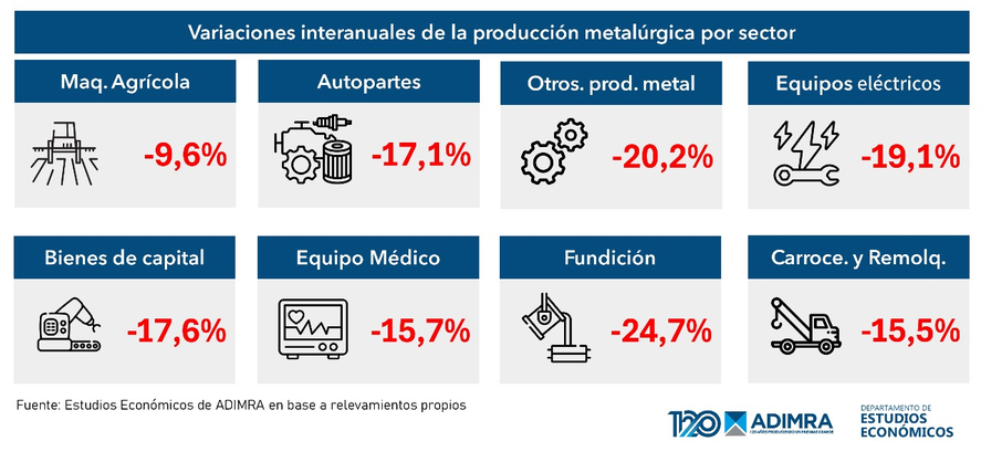 En el análisis hacia el interior de la industria metalúrgica, el informe señala una caída sistémica en todos los subsectores que componen este entramado industrial, bajas que van desde -10% hasta -25%.