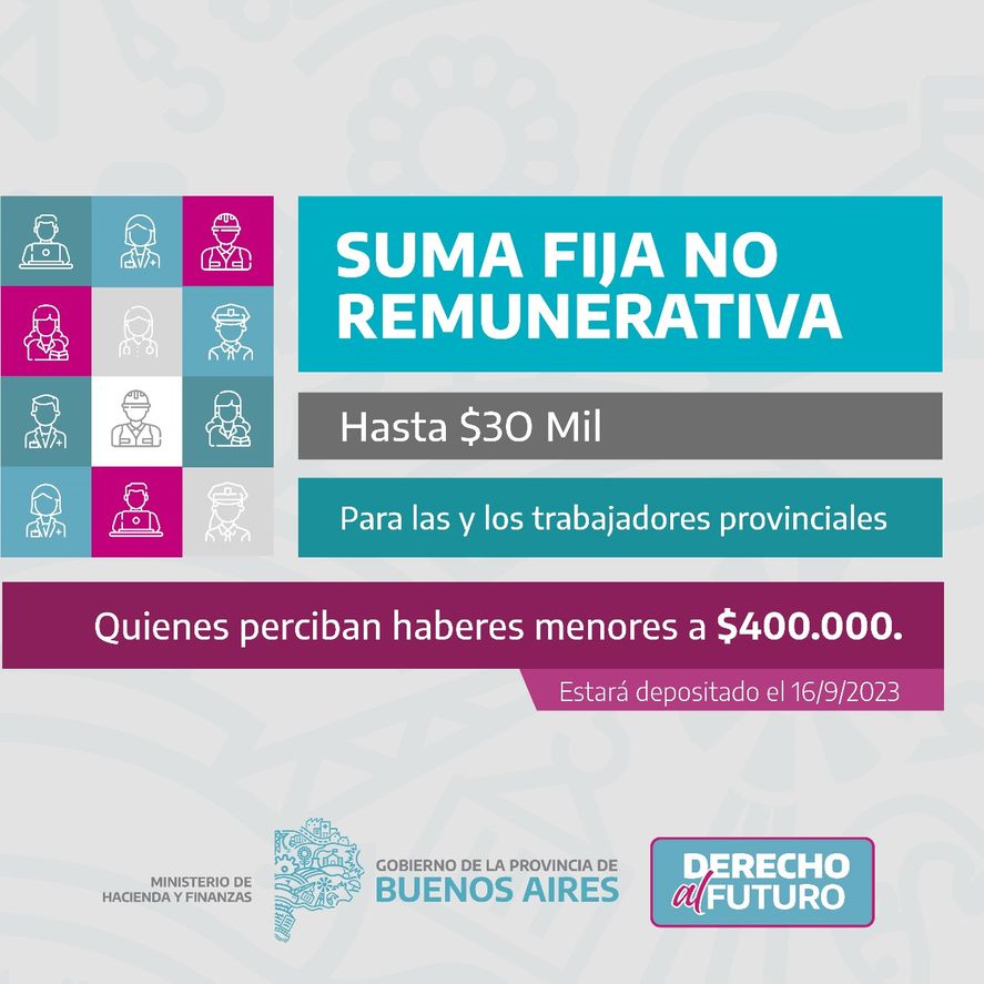 “Cumpliendo el compromiso asumido con las y los representantes gremiales, y siguiendo los lineamientos del Gobierno Nacional, mañana aproximadamente 500 mil trabajadoras y trabajadores bonaerenses tendrán depositada en sus cuentas la suma fija no remunerativa de $30 mil”, anunció López vía X (ex Twitter).