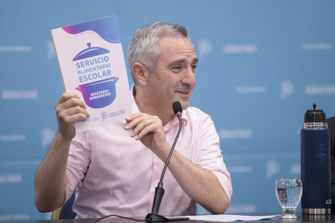 El gobernador bonaerense Axel Kicillof encabezó este martes la presentación del 1° Recetario Bonaerense del Servicio Alimentario Escolar (SAE), una iniciativa que reúne preparaciones surgidas de los 135 municipios de la provincia. El acto se desarrolló en el Salón Dorado de la Casa de Gobierno y contó con la presencia del ministro de Desarrollo de la Comunidad, Andrés Larroque; del ministro de Desarrollo Agrario, Javier Rodríguez; y del intendente de La Plata, Julio Alak.