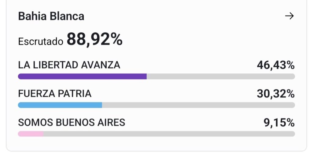 Bahía Blanca, el distrito con mayor cantidad de electores de la sección (260.462 sobre 672.483), ratificó esta tendencia: La Libertad Avanza alcanzó 46,46% para diputados provinciales, seguida por Fuerza Patria con 30,30% y Somos Buenos Aires con 9,15%. En concejales, la boleta de La Libertad Avanza se mantuvo en 46,21%, dejando a Fuerza Patria con 30,99% y a Somos con 9,36%.