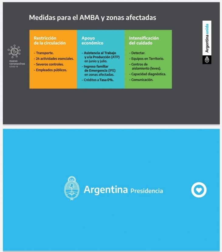 Las nuevas restricciones corren para el transporte, que se limitará a servicios esenciales, severos controles; combinados con la intensificacion de los operativos de detección, de la capacidad diagnóstica y de las medidas de prevención. Estas son las filminas que apoyaron el análisis presidencial.