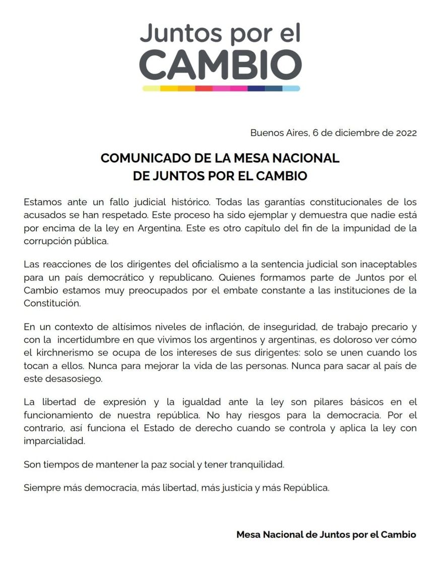 A nivel institucional, Juntos por el Cambio emitió un comunicado en el calificó a la sentencia como “un fallo histórico”.