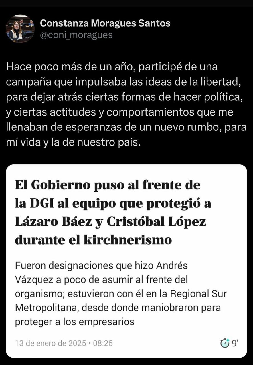 “Hace poco más de un año, participé de una campaña que impulsaba las ideas de la libertad, para dejar atrás ciertas formas de hacer política, y ciertas actitudes y comportamientos que me llenaban de esperanzas de un nuevo rumbo, para mí vida y la de nuestro país”, comenzó diciendo la exlibertaria acompañando estas palabras con el recorte de la noticia que anunciaba que el gobierno de Javier Milei había puesto al frente de la DGI a un funcionario que habría protegido a los empresarios Lázaro Báez y Cristóbal López.