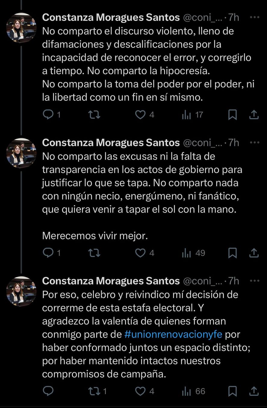 El hilo de X da cuenta de valores que, siempre según la legisladora, no comparte con La Libertad Avanza. En el posteo final da cuenta que para ella, el partido de Javier Milei es una estafa electoral y es por eso que celebra y reivindica su decisión de abandonar el espacio manteniendo intactos los compromisos de campaña.