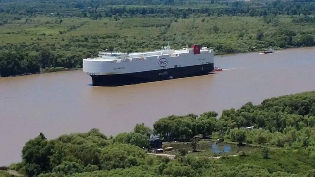 El barco BYD Changzhou llegó este lunes a la Terminal Zárate sobre el Río Paraná y comenzó la descarga de más de 5 mil autos chinos destinados al mercado interno de la Argentina.