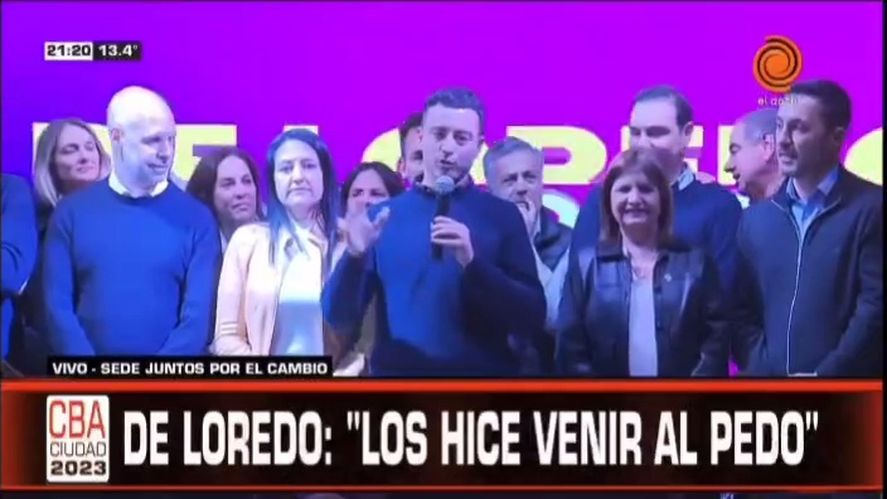 Un momento de extrema singularidad se vivió en la aceptación de la frustrante derrota de Juntos por el Cambio para la Intendencia de Córdoba Capital, cuando el candidato Rodrigo de Loredo, apoyado extrañamente tanto por Patricia Bullrich como por Horacio Rodríguez Larreta, aceptó la derrota aún antes de conocerse ni siquiera el 1% de los votos escrutados en el recuento provisorio, y además lanzó una frase reveladora e impactante como disculpas a los precandidatos nacionales de la principal fuerza opositora, al decirles en el escenario la frase más retumbante de la noche: “Los hice venir al pedo“.