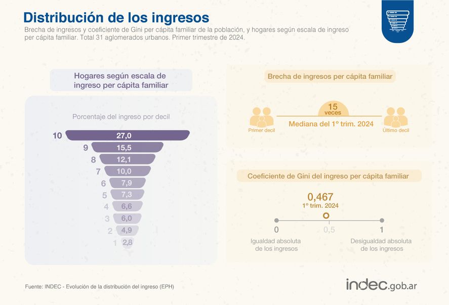En el caso de la Argentina, el 10% de los hogares con mayor ingreso per cápita familiar concentró 27% del total del ingreso en el primer trimestre de 2024, mientras que el 20% de los hogares con mayor ingreso concentró el 42,5% del total del ingreso. Y el 10% que más gana lo hace en promedio 15 veces más que el 10% que menos ingresos tiene. Ésto hizo aumentar de 0,435 a 0,467 el cociente de desigualdad.