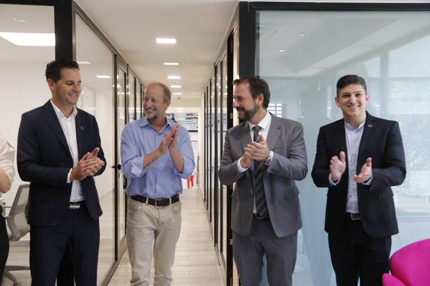 El jefe de Gabinete del Gobierno de la Provincia de Buenos Aires, Martín Insaurralde, y el secretario de Economía del Conocimiento de la Nación, Ariel Sujarchuk, participaron de la inauguración de la planta de elaboración de reactivos de diagnóstico de AP-Biotech en Lomas de Zamora junto a los titulares de la empresa, Pablo Armas y Adrián Kalstein.