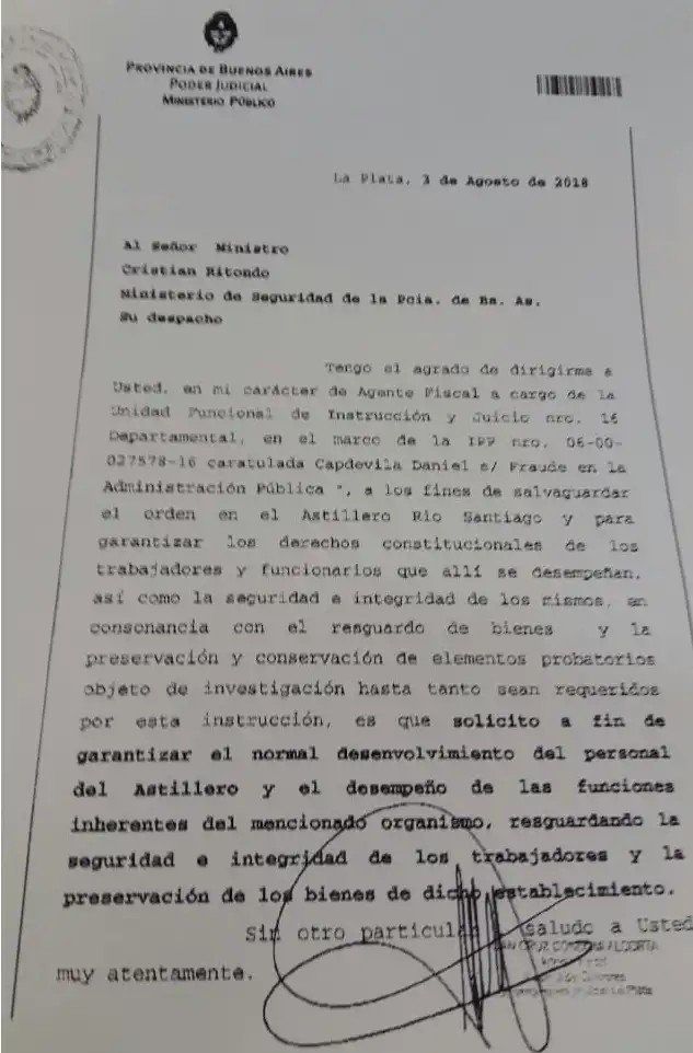 “Un fiscal ha librado un oficio requiriendo la intervención del Ministerio de Seguridad de la provincia al cual le ‘solicitan a fin de garantizar el normal desenvolvimiento del personal del Astillero y el desempeño de las funciones inherentes del mencionado organismo, resguardando la seguridad e integridad de bienes de dicho establecimiento’”, agrega el documento.
