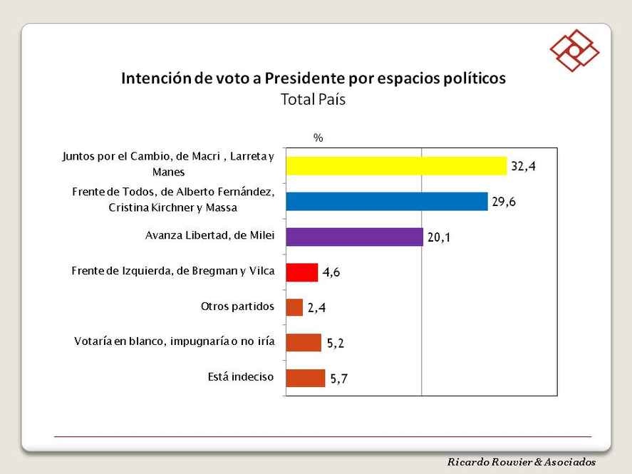Con ese contexto, ante la consulta sobre la intención de voto a presidente por espacio político, el Frente de Todos (29,6) pierde ante Juntos por el Cambio (32,4) y se destaca con un buen porcentaje el espacio de Avanza Libertad (20,1) conducido por Javier Milei, aunque retrocedió un tanto respecto de la encuesta anterior.