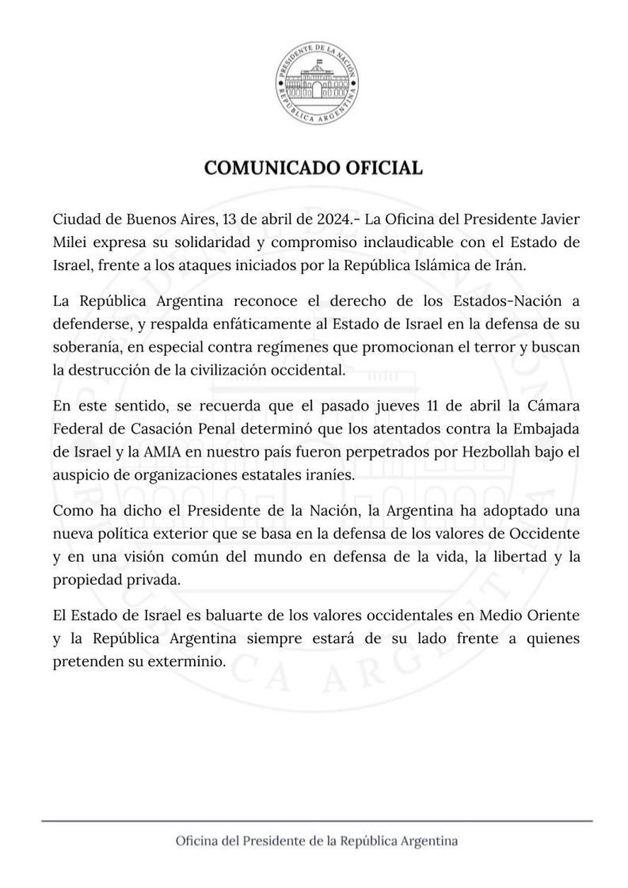 “Milei expresa su solidaridad y compromiso inclaudicable con el estado de Israel, frente a los ataques iniciados por la República Islámica de Irán”, comienza diciendo el comunicado y unos parrafos más abajo menciona la causa: “Se recuerda que el pasado jueves 11 de abril, la Cámara Federal de Casación Penal determinó que los atentados contra la Embajada de Israel y la Amia en nuestro país fueron perpetrados por Hezbollah bajo el auspicio de organizaciones estatales iraníes”.
