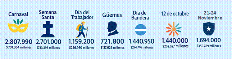 Lo cierto es que el fin de semana pasado fue el último fin de semana largo del año y de acuerdo a los informes de la CAME quedó tercero en el ranking de los que mayor movimiento generaron. En primer lugar se ubicó el Carnaval y segundo Semana Santa con 2,8 y 2,7 millones de viajantes, respectivamente. “El impacto de estos feriados fue significativo no sólo por la cantidad de personas movilizadas, sino también por su efecto dinamizador sobre las economías regionales”, indicaron.