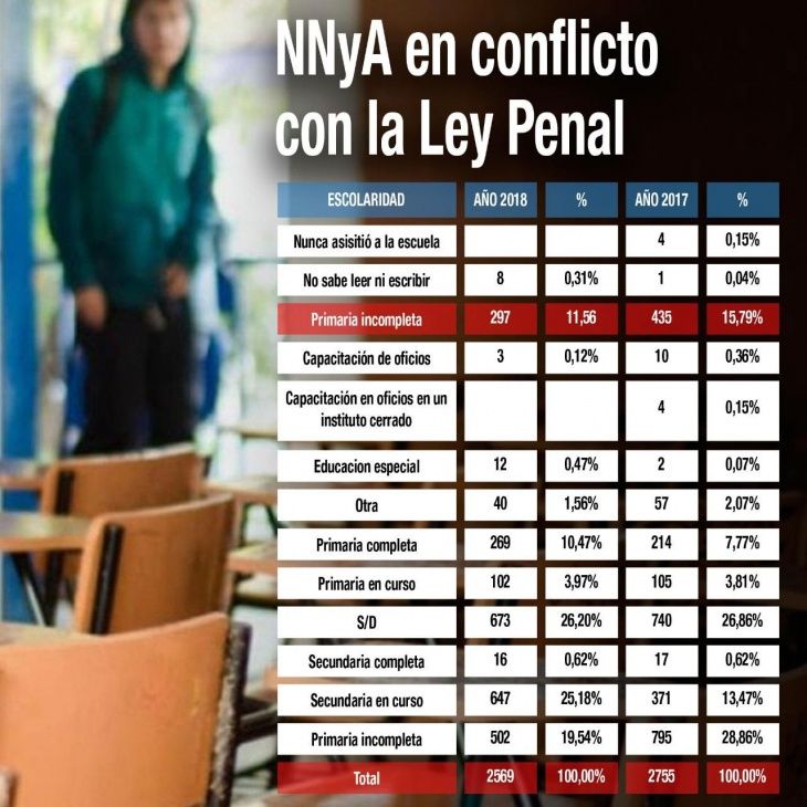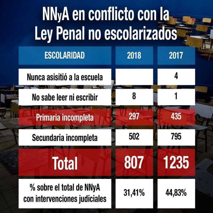 En ese sentido, el Defensor del Pueblo Adjunto de la provincia de Buenos Aires, Walter Martello, señaló que “más del 31% de los jóvenes, de entre 13 y 18 años, que resultaron denunciados y/o imputados por algún hecho delictivo, no estaban escolarizados. Peor aún: 1 de cada 10 ni siquiera terminó la primaria, y se registran casos de NNyA que nunca aprendieron a leer ni a escribir”.