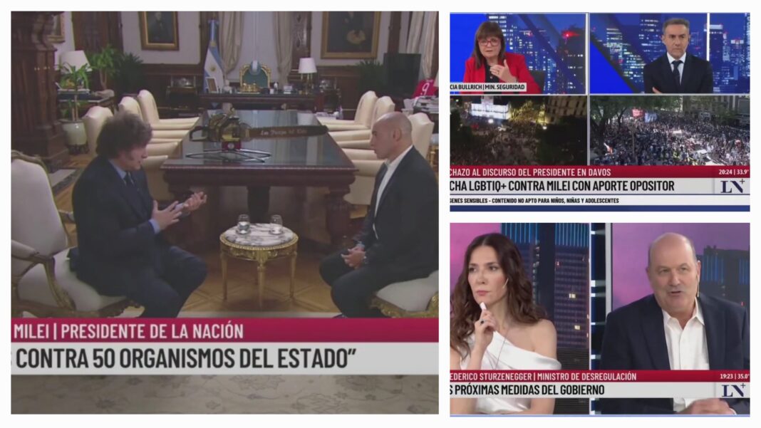 Pero mientras en el Boletín Oficial se estampaba la muerte formal de la Secretaría de Prensa, en la pantalla de La Nación+ se vivía un verdadero festival de entrevistas oficiales. En una misma noche, tres ministros del Gobierno pasaron por los estudios del canal: Federico Sturzenegger, el flamante ministro de Regulación, dialogó con Cristina Pérez en su debut en la señal; luego fue el turno de Patricia Bullrich, que conversó con Luis Majul; y para el cierre, el propio presidente Javier Milei se sentó con Esteban Trebucq.