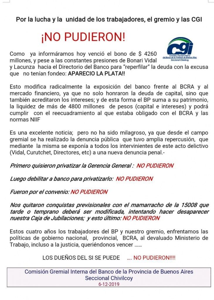 Finalmente, ante la denuncia pública de la Comisión Gremial Interna (CGI) de los trabajadores del Banco Provincia, el gobierno de María Eugenia Vidal pago los 4.260 millones luego que fracasara un pedido al directorio para reperfilar esa deuda con un nuevo bono a pagar en diciembre de 2020. Se trata del bono serie I, clase II (código BCBA: BPD19).