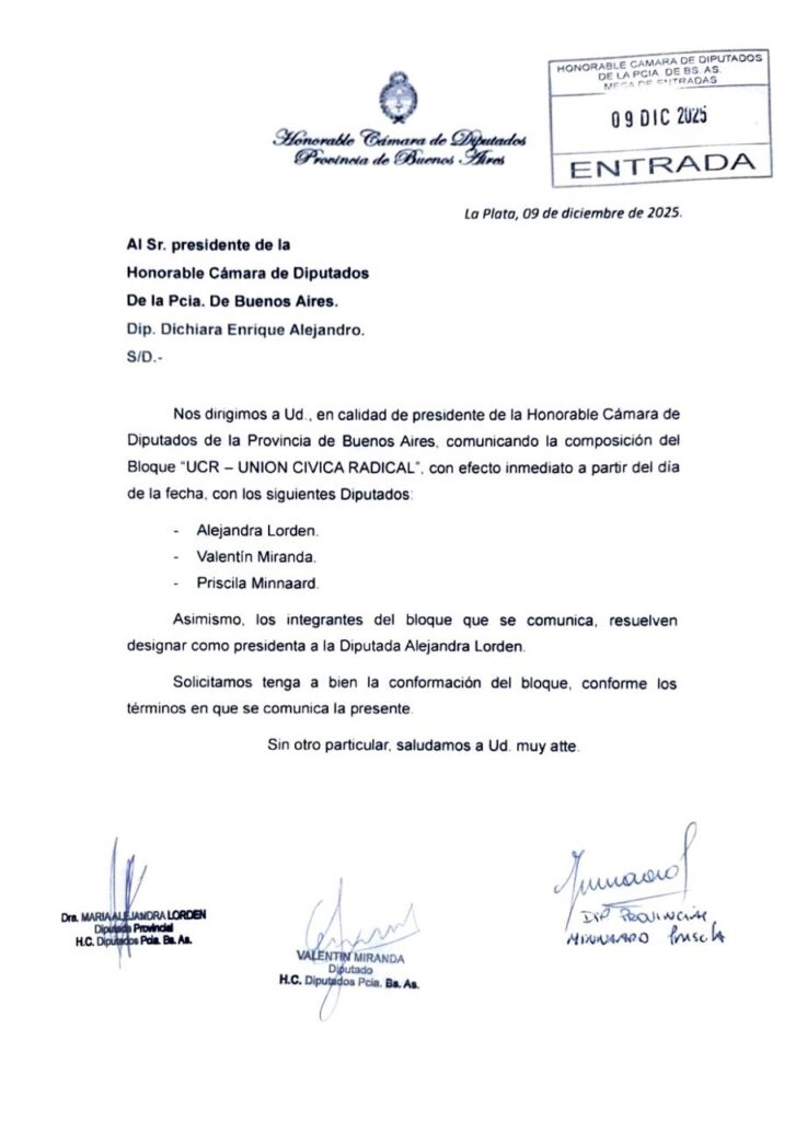 Se trata de Alejandra Lorden, Valentín Miranda y Priscila Minnard, quienes conformarán un bloque que podría llamarse “UCR – Unión Cívica Radical” o simplemente “Bloque Radical”. La decisión se aceleró luego de que Lorden, quien ocupaba la vicepresidencia de la Cámara, quedara afuera de ese lugar en el marco del acuerdo general por la ley de Financiamiento. Ese puesto será para Matías Civale, el diputado de Tandil ligado al intendente Miguel Lunghi.