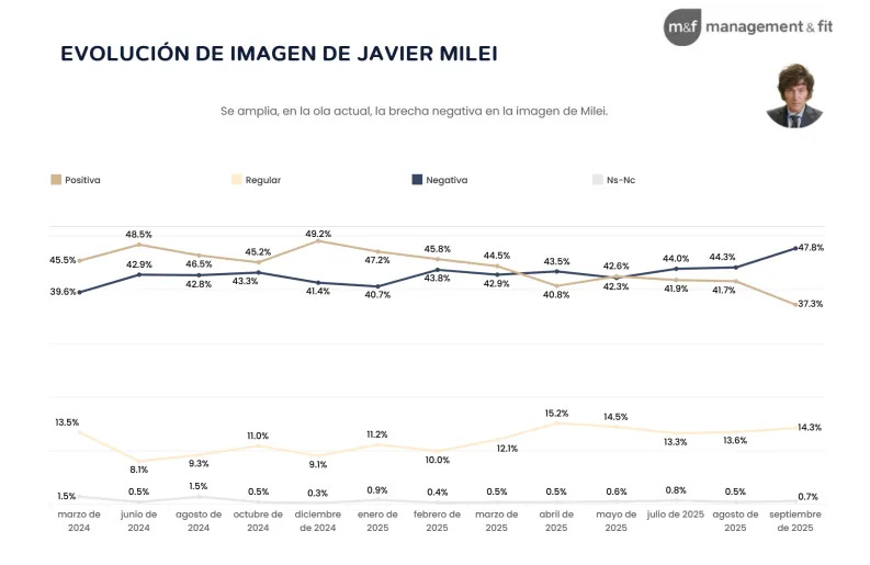 La última medición de Management & Fit confirmó un escenario adverso para el presidente Javier Milei: su imagen positiva cayó al nivel más bajo desde diciembre de 2023, mientras que la negativa superó ampliamente a la primera.