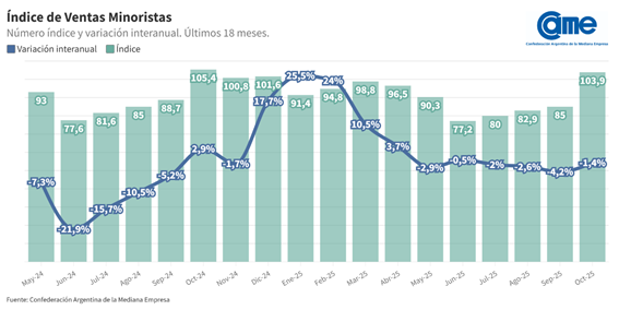 Según la CAME, el mes pasado las ventas minoristas pymes cayeron un 1,4% (a precios constantes) respecto a 2024. En la comparación mensual desestacionalizada, se observó un aumento del 2,8% y en lo que va del año las las ventas acumulan una suba del 4,2% en comparación con el mismo periodo del año pasado.