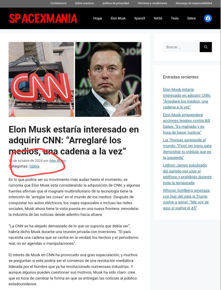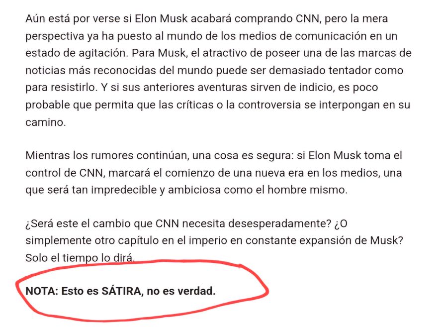 Lo que Milei afirmó sobre una supuesta compra de CNN por parte de Elon Musk surgió de un artículo satírico del sitio SpaceXMania, conocido por su contenido humorístico y de parodia sobre Elon Musk y sus empresas. La replicación azorada por parte de usuarios internacionales en varios idiomas, convierte a la afirmación del presidente argentino en una verdadera vergüenza mundial.