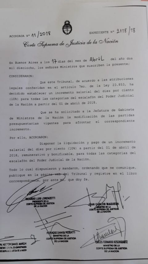 El incremento salarial lleva la firma del presidente de la corte Ricardo Lorenzzetti y los ministros Horacio Rosatti, Juan Carlos Maqueda, Carlos Rosenkrantz y el secretario de administración Juan Carlos Marchi. Será de un 10% a partir del 1 de abril de este año.