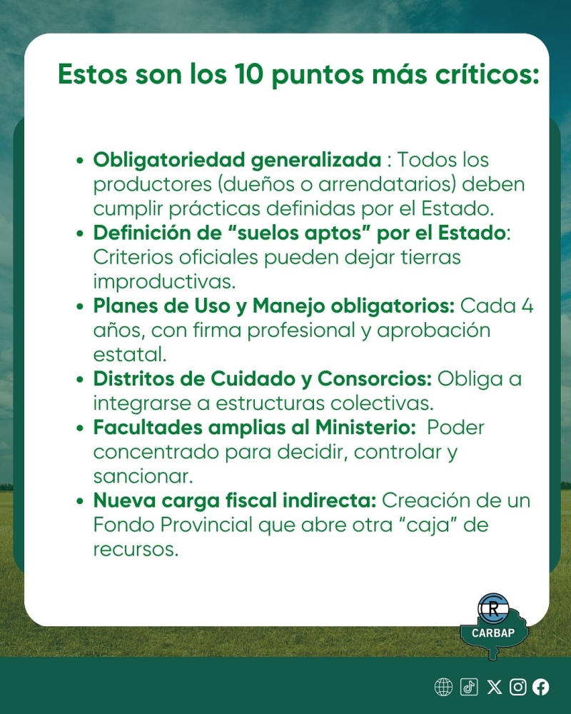 Carbap alertó además que el Estado podría definir unilateralmente qué suelos son “aptos” o no para la producción, y que esa discrecionalidad podría “dejar tierras improductivas” o condicionar el uso de los campos.