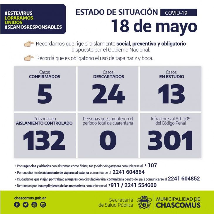 En el marco de la situación de transmisión local en conglomerados, hasta el lunes 18 la ciudad cuenta con 5 casos confirmados de los cuales cuatro pertenecen al área de salud, 13 en estudio, 24 descartados y 132 personas en aislamiento controlado. Ante esta situación, el jefe comunal transmitió a los funcionarios el trabajo que realizan desde el inicio de la pandemia junto a la Región Sanitaria XI, profesionales de la salud, científicos y expertos en la materia.