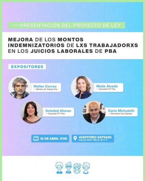 La propuesta será presentada oficialmente el 12 de abril a las 5 de la tarde en el auditoria Satsaid de La Plata (calle 39 789, entre 10 y 11). Además de las autoras estarán el ministro de Trabajo de la provincia de Buenos Aires, Walter Correa, y el secretario general del sindicato anfitrión, Dario Micheletti.