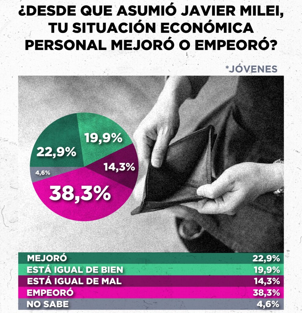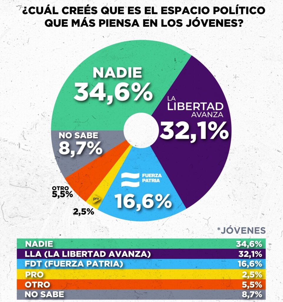 La mayoría de los encuestados consideró que ningún partido político piensa en los jóvenes. El 34,6% contestó eso mientras que el 32,1% optó por La Libertad Avanza y solo el 16,6% por Fuerza Patria. De todas maneras, la principal preocupación de este sector no es la representación política sino la situación económica. Al menos eso respondió el 26,8% de los consultados por Zuban Cordoba y Asociados. En segundo lugar aparece el trabajo (con el 19,5%) y tercero la educación (con el 17,7%).