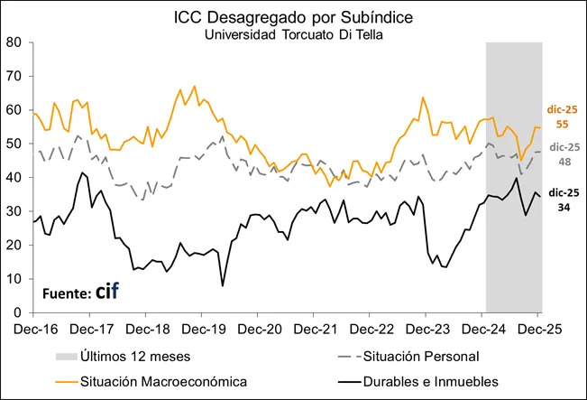 Un apartado relevante del informe está vinculado a los subíndices que componen el ICC. En diciembre, el componente de Bienes Durables e Inmuebles fue el más afectado, con una baja mensual del 3,38%, aunque mostró una suba del 5,54% en la comparación interanual. La Situación Macroeconómica retrocedió 0,53% en el mes y se ubicó 4,69% por debajo del nivel de diciembre de 2024. Por su parte, la Situación Personal se mantuvo prácticamente estable, con una leve suba mensual del 0,03%, aunque cayó 1,16% frente a un año atrás.