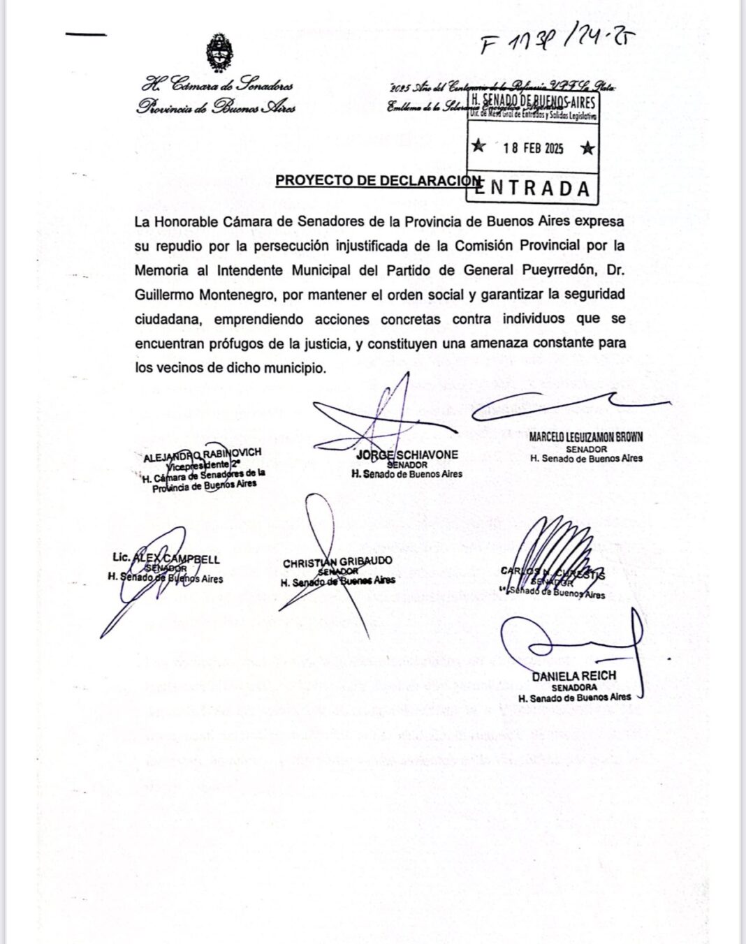 El proyecto ingresado reza que “La Honorable Cámara de Senadores de la Provincia de Buenos Aires expresa su repudio por la persecución injustificada de la Comisión Provincial por la Memoria al Intendente Municipal del Partido de General Pueyrredón, Dr. Guillermo Montenegro, por mantener el orden social y garantizar la seguridad ciudadana, emprendiendo acciones concretas contra individuos que se encuentran prófugos de la justicia, y constituyen una amenaza constante para los vecinos de dicho municipio”.