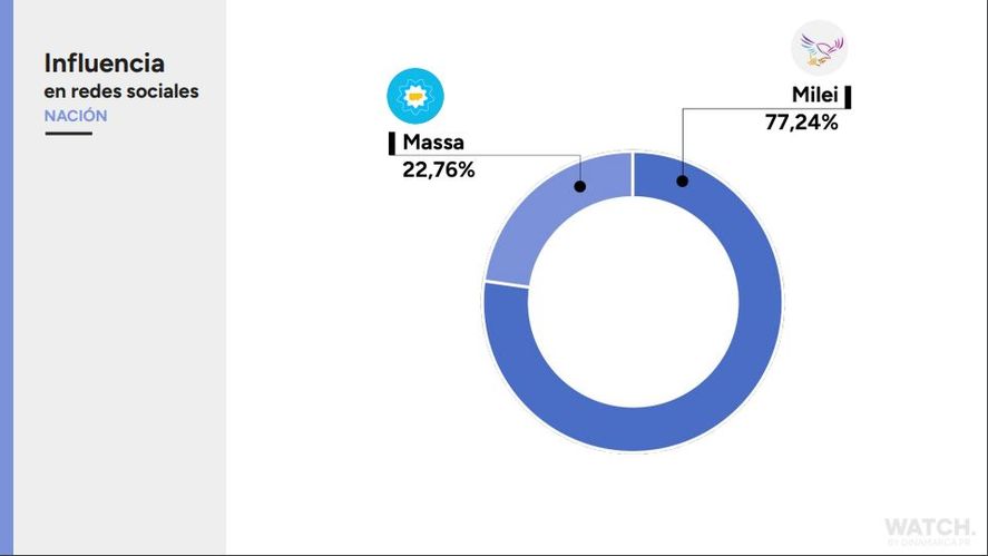 Según el último informe Watch publicado por Dinamarca PR, el candidato libertario sigue liderando dentro de las redes sociales pero empieza a perder influencia en la conversación, mientras que Sergio Massa sigue creciendo en este apartado y se vuelve cada vez más influyente.