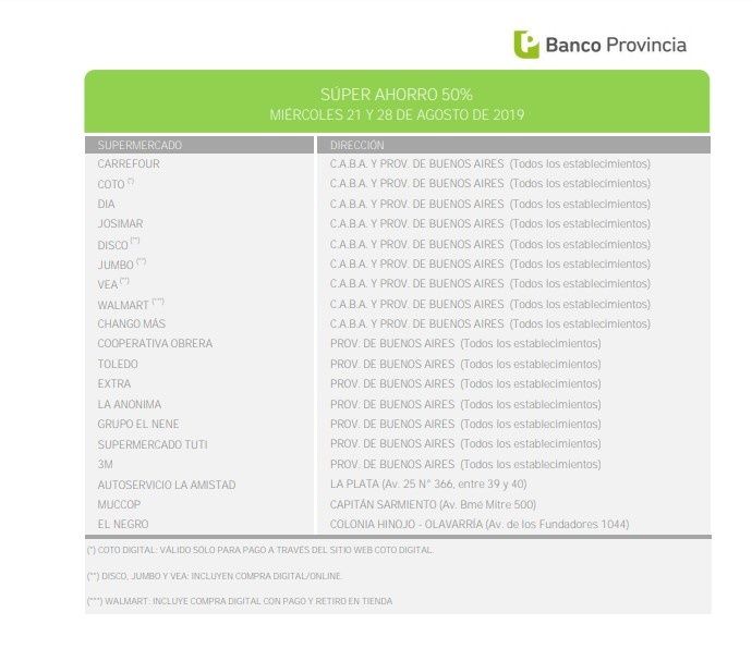 La promoción es para la compra de artículos de primera necesidad. Para acceder al beneficio es necesario tener las tarjetas Visa Débito, Visa Crédito y MasterCard Crédito, emitidas por el Banco Provincia. Y, cabe aclarar, que el reintegro de la compra con tarjeta de débito se efectúa dentro de los 10 días hábiles; y con la de crédito hasta en el resumen siguiente a aquel en el que se ingresó el consumo.