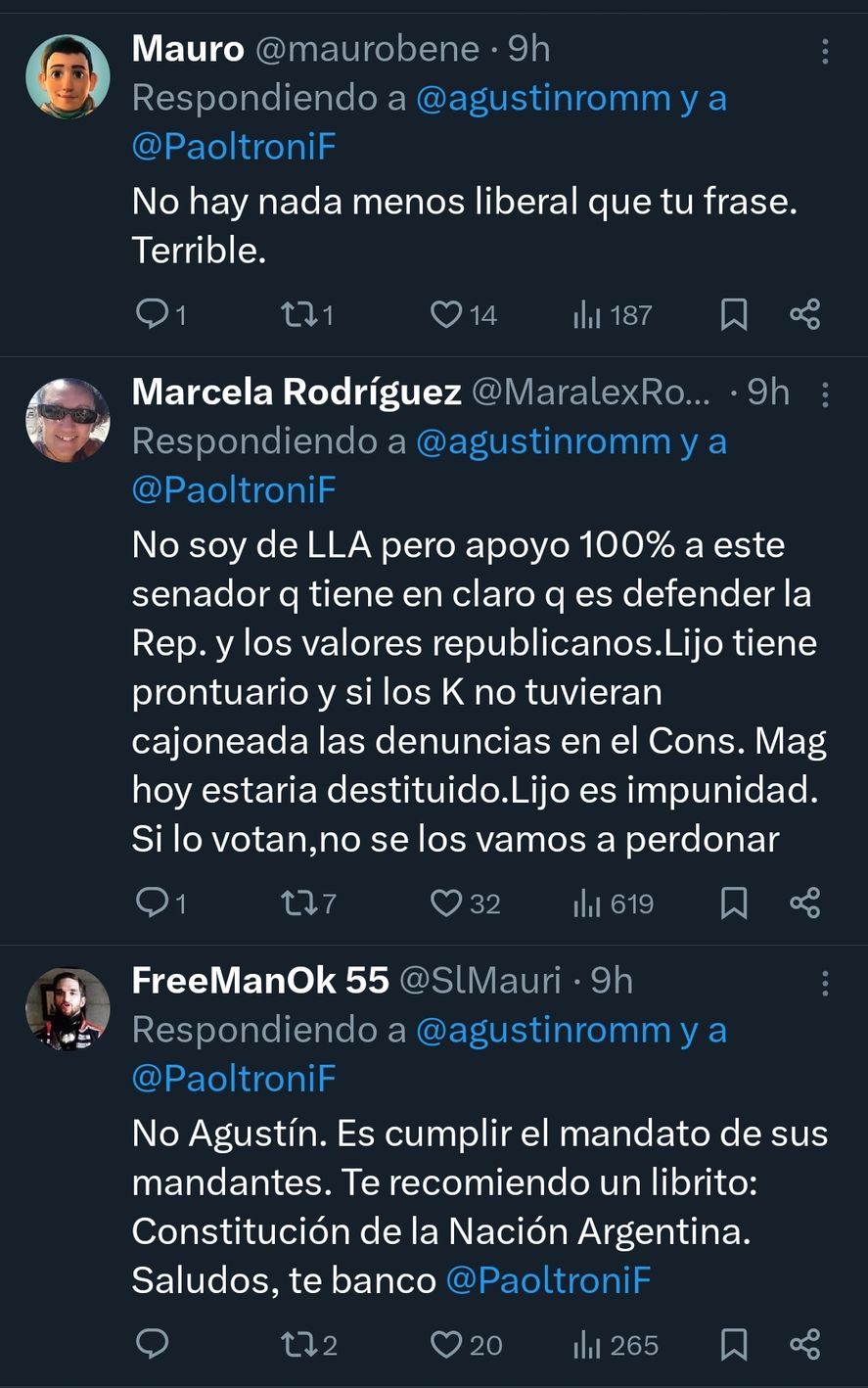 Su mensaje no fue bien recibido por todos en el movimiento. El diputado bonaerense libertario Agustín Romo, conocido por su comportamiento en redes sociales que lo asemeja más a un troll que a un legislador, respondió con una declaración que generó aún más disrupción: “Nuestro único trabajo es cumplir las órdenes del Presidente, Paoltroni”, replicó imperativo.